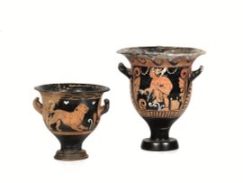 Di particolare interesse sono i tre crateri a campana della collezione: uno presenta su entrambi i lati figure di animali noti per la loro potenza (un toro rappresentato nell’atto di caricare e un leone); quello di dimensioni maggiori è connotato da un unitario tema di esaltazione del dio del vino Dioniso (h. 27 cm). Sul lato A il dio è rappresentato con un tirso (suo attributo costituito da un bastone su cui è infissa una pigna), sul lato B compare invece un’agile figura del suo animale, una pantera con il manto maculato.