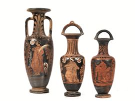 La produzione attica è rappresentata da una lekythos con decorazione a figure nere su fondo bianco (h. 21 cm), prodotto attribuibile alla cerchia del Pittore di Haimon, esponente della più tarda produzione, già riferibile all’inizio del V secolo a.C.