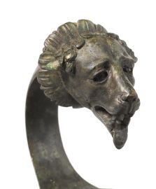 Lucerna in bronzo con testa di animale. Il serbatoio ha un profilo semplice, con la terminazione del becco espansa. L’ansa, sormontante, è connessa ad una testa di leone da una corona di foglie stilizzate. L’animale è raffigurato con le fauci schiuse e la lingua a penzoloni: gli occhi, la criniera e il muso sono resi in grande dettaglio, degno di una vera e propria opera plastica. H. 15,2 cm; lungh. 22,8 cm