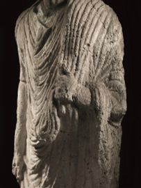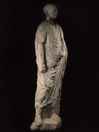 Destinata ad essere posta entro una grande nicchia (il retro è solo sommariamente sbozzato), questa scultura, che possiamo immaginare essere una statua onorifica o funeraria, presenta un ricco cives romanus nel suo abito più tradizionale e ideologicamente significativo, la toga, su cui si veda la recente pubblicazione: M. Tellenbach, R. Schulz (a cura di), Die Macht der Toga: Dresscode im Römischen Weltreich, Berlin 2013. Ed è proprio la veste, con le numerose pieghe e l’elaborata forma, ad essere il vero soggetto della scultura: il fatto che si arresti sopra le caviglie consente di datare la scultura al più tardi fra la fase finale della repubblica e gli anni del principato di Augusto.