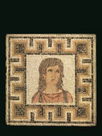 Pannello musivo con busto femminile racchiuso entro una ricca cornice meandriforme. La donna volge la testa lievemente verso sinistra, indossa una veste rossa con due lacci turchese sulle spalle. Il volto e la capigliatura sono resi con grande dettaglio (la donna indossa perfino gli orecchini), con le sfumature di colore dei capelli lunghi che sono rese con ciocche di colore marrone-grigio. 49,5 x 50 cm. Gli altri due pannelli, di soggetto analogo nonostante la differenza di dimensioni (39 x 47 cm e 32,5 x 44 cm), presentano un vivace quadretto con un coniglio nell’atto di rodere degli acini d’uva da un grappolo.