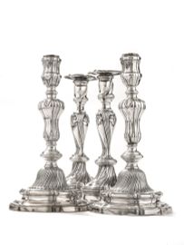 in argento, basi circolari sagomate e gradinate, fusti a balaustro scanalati e decorati da foglie, alt. cm 25,5, g 1100 (2)