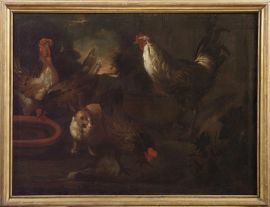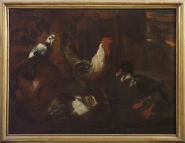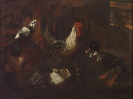 La bella coppia di nature morte qui proposta raffigurante galli, anatre e conigli, di cui si conoscono altre due versioni a Roma e a Firenze, sono opere del pittore genovese Giovanni Agostino Cassana.