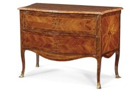 lastronato in noce e altre essenze, piano in marmo rosa di forma sagomata con bordo a becco di civetta, fronte lievemente mosso a due cassetti inquadrati da profilature e centrati da motivo a stella, fianchi analogamente ornati, pendaglina sagomata, gambe mosse con piedini calzati in bronzo, cm 96x138x69,5