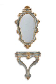 in legno intagliato laccato con profilature in oro; console con pianetto sagomato in marmo incassato, fascia sottopiano profilata in oro con decori fogliacei, grembiale mosso con decoro rocaille al centro su gambe sinuose profilate da volute in oro e decorate nella parte superiore da intaglio fogliaceo che si riuniscono in basso a creare un motivo rocaille al centro, cm 58x50x28; specchiere con cornice di forma sagomata ornata al centro inferiore da piccolo festone dal quale si dipartono volute che risalgono fino al centro superiore a centrare un vaso di frutta, cm 86x51