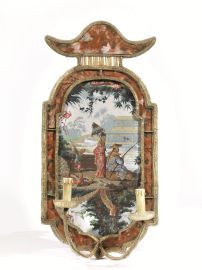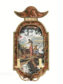 di forma sagomata ad imitare una pagoda, in legno con cornici in vetro dipinto a finto marmo e impreziosito nei profili da cordoni in perline dorate; cartella centrale decorata da una scena a cineserie dipinta su carta, due bracci ricurvi con piattello reggono le candele, cm 77x37 (4)
