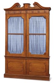 in mogano, corpo superiore a due sportelli mistilinei sormontati da fascia intagliata a motivo di scanalatura alternata a fiori a sostenere la cimasa di forma architettonica a doppia voluta decorata da rametti di foglie trattenuti da un nastro, corpo inferiore a due sportelli sformellati all’interno dei quali una delle due presenta sei cassetti appaiati, base modanata, cm 285x177x39