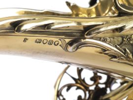 in vermeil, finemente cesellato e sbalzato in foggia di carro a due ruote, corpo profilato a volute impreziosite da festoni e cesellato a motivi romboidali formati da fiori, cm 24x30x14, g 1540