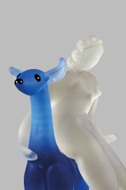 Frosted crystal sculpture, white naked woman with light blue fawn, black base decorated with yellow flowers and white leaves