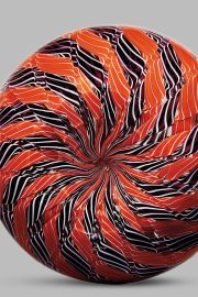 Polychrome glass, internally decorated with diagonal amethyst and coral bands with white threads, bowl body with extroflexed rim
