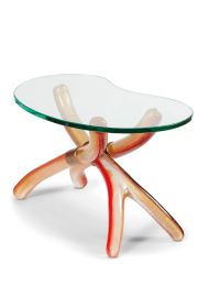 Small oval-topped crystal table resting on sinous legs which cross and separate, in clear and gold glass with shading of coral and amethyst