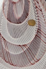 Vetro trasparente decorato con segmenti diagonali di fili bianchi alternati a fili ametista a festoni, corpo a goccia schiacciata