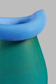 Vetro di colore verde opaco con oro, internamente in blu opaco, corpo di forma ovoidale schiacciata con collo rovesciato esternamente