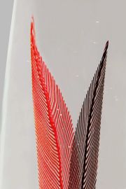 Obelisk in clear glass decorated with two coral and amethyst feathers