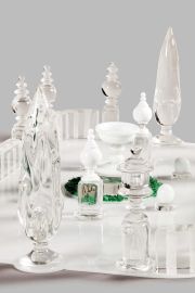 "Dall'incontro tra Van Day Truex, l'Art Director della Tiffany, ed Archimede Seguso nel 1960 non potevano che nascere creazioni speciali, prototipi e oggetti realizzati per il godimento degli autori e di pochi eletti al tempo stesso. Ecco che gli antichi trionfi da tavola settecenteschi, preparati per reali e nobili, divengono il pretesto per la creazione di nuovi autentici capolavori in vetro per tavole moderne altrettanto raffinate. Su quel progetto Archimede Seguso lavorò a fondo, creando piccoli pezzi vitrei componibili: fontane, colonne, statue, siepi, cespugli di bosso. II tutto veniva disposto sul tavolo, secondo un disegno prestabilito che privilegiava I'armonia di accordi formali, dei contrappunti, dei chiasmi, dei delicati incastri di forme.