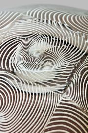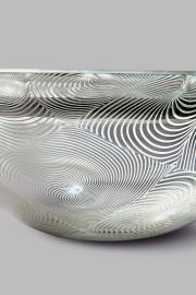 Vetro decorato internamente con fili di lattimo bianco con motivo stellato, corpo di forma circolare con labbro leggermente rientrante