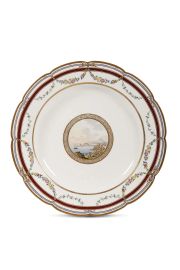 The decorations of this assortment of porcelain plates includes panoramic views enclosed within a central medallion and surrounded, on the lip, by flowered garlands and blue and red fillet borders extending to the rim. The porcelain is soft-paste and shows some imperfections and signs of wear: crackling, chipping and hairline cracks. The gold is not always in a perfect state of conservation on all the pieces, although the clarity of the views at the centres of the compositions is unaltered. Of note certain details visible in the secondary decoration, introduced during manufacture, such as the lack of several berries in the garland on the Veduta del Golfo di Messina (View of the Gulf of Messina) plate, on which, additionally, the principal view is out of alignment with respect to the titling on the reverse.