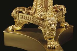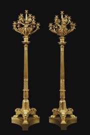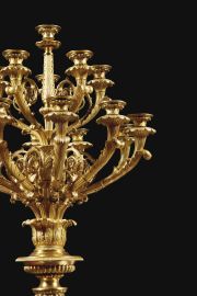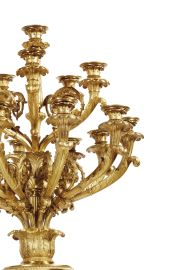 in gilded bronze. With a shaped triangular platform on which rest three winged ferine paws supporting the tripod stand, decorated at the corners with leonine masks with long ram’s horns and carved along the sides with recessed bands of repeating plant motifs, on which the base rests. The base is in the form of large acanthus leaves flaring open in a downward direction and caught at the top by a ring with baccellatura decoration; the grooved stem, tapering upward, which departs from this point, is sculpted at the bottom with repeats of long, upward-pointing leaves, followed by a band chiselled with repeats of small, overlapping lanceolate leaves and culminating in a capital with long lanceolate leaves; the narrow neck over the capital supports a disk, engraved with baccellature, which in turn supports a cup of flaring acanthus leaves from which there rise fourteen arms in the form of volutes, decorated with ramages of foliage on two orders and framing a central arm. Size: 250 x 62 x 62 cm.