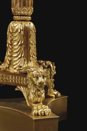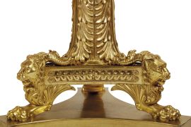 This pair of monumental torchères finds numerous comparison pieces in the production of the English Regency era, when many exemplars from antiquity were rediscovered and were often taken as models and as sources of inspiration for the manufacturing of the time. In particular, while in France the merit for kindling interest in the forms adopted in ancient Rome goes to architects Charles Percier and Pierre François Léonard Fontaine and their Recueil de Décorations Intérieures (1801), in England, in 1814, Moses published the repertoire entitled Vases, Altars, Paterae, Tripods, Candelabra, Sarcophagi, a collection of studies and illustrations of ancient models, in many cases marbles displayed at the Louvre. And this was the point of departure for a fruitful and highly successful production that is witnessed today by several of the exemplars which have come down to us and which are comparable with the torchères we are proposing here. In detail, our torchère shows many similarities with works attributed to William Collins, both in the overall design and in choice of decorative motifs. Collins was active in London between 1808 and 1852; among his most important patrons and main clients was the third Duke of Northumberland to whom, from 1822 to 1839, Collins supplied the entirety of his lighting fixtures in both gilded and patinated bronze, including the ‘5 Altar Pedestals with 5 Lamps for Grand Staircase’ cited in an invoice dated 23 March 1823 (C. Sykes, Private Palaces: Life in the Great London Houses. New York 1986, p. 239), which share many features with our torchères. Production of this model continued even through the decades following the Regency era, during which time some small variations were introduced, such as – and our piece offers an example – the addition of arms at the upper extremities.