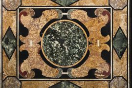 The tabletop decoration is composed of a tondo within a cartouche in the centre square, surrounded by a framing band marked out by alternating octagons and rhombi. The vivid polychromy of the whole is obtained exclusively through use of marbles and stones of archaeological provenance, exception made for the black ‘marble’ from Flanders used for the background of the centre portion and the outlines of the framing strip.