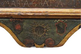 La centina alla sommità della tavola racchiude la patetica iconografia del Vir dolorum tra due angeli in volo.