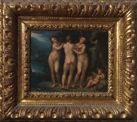 Esemplato sul celebre gruppo scultoreo conservato nella Biblioteca Piccolomini a Siena e ripreso anche da Raffaello nel dipinto ora a Chantilly, Musée Condé, dalla collezione di Scipione Borghese, il motivo delle Grazie accompagnate da Amore in un paesaggio compare, appena variato, nel noto dipinto a Roma alla Galleria Borghese (inv. 527; olio su tela, cm 35x41,5) di cui la nostra inedita tela costituisce una replica variata, o forse una prima versione. Oltre che gli elementi paesistici, in entrambi i casi esemplati sui modelli di Paul Bril, le differenze riguardano i visi delle Grazie, la posizione della faretra di Eros addormentato, e soprattutto la figura di un secondo amorino Anteros (?) in alto a sinistra nella versione romana.