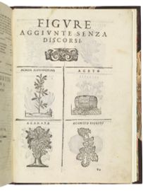 Second edition, augmented with the final 10 pages of "Figures added without speeches", which contain 112 additional woodcuts of plants, trees, etc., not present in the first edition of 1585.