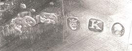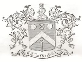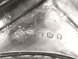 in argento. Base quadrata con quattro piedini a voluta terminanti a zampa ferina. La coppa è decorata da baccellature e stemma araldico inciso con motto iscritto BE MINDFUL, due anse unite al corpo da teste ferine. alt. cm 27, diam cm 38, g 3710
