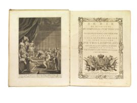 4 volumi in folio (455 x 368 mm). Vol. 1: antiporta, frontespizio, ritratto di Pietro Leopoldo granduca di Toscana, [121] carte di testo e [50] tavole calcografiche. Vol. 2: antiporta, frontespizio, ritratto di Maria Luisa granduchessa di Toscana, [137 (di 138)] carte di testo e [50] tavole calcografiche. Vol. 3: antiporta, frontespizio, [129] carte di testo e [50] tavole calcografiche. Vol. 4: antiporta, frontespizio, [132 (di 134)] carte di testo e [51 (di 52)] tavole calcografiche. Numerose testatine, iniziali e finalini calcografici. Piena pergamena coeva con tasselli dorati ai dorsi (quello del quarto volume leggermente difforme), tagli spruzzati. Nel primo volume, l’“Indice dei ritratti” è rilegato in fine e non all’inizio tra la “Spiegazione” e l’“Avvertimento”, il frontespizio è un po’ ingiallito e il primo fascicolo un po’ protruso. Nel secondo volume manca una carta di testo (sebbene non vi siano visibili ammanchi nel testo) e v’è una piccola macchia d’unto ad un paio di carte finali. Nel terzo volume, un po’ sciolto, è assente il ritratto del dedicatario Leopoldo II. Nel quarto volume, anch’esso un po’ sciolto, mancano il ritratto di Anton Maria D’Andrea Salvini e le 2 carte di testo con la sua biografia. Restauro al margine inferiore di tutti i frontespizi, qualche tavola leggerissimamente ingiallita, minimi difetti alle legature.