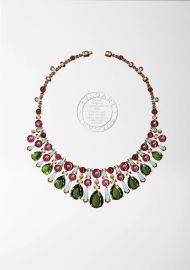 impreziosita da tormaline per ct 67,21, quindici peridots yellowish green per ct 72.14 circa, dodici spinelli red per ct 21,76 circa, ventisei turchesi taglio fantasia, ventitre diamanti taglio brillante per ct 9 circa, punzone 750, firmato Bulgari, accompagnata dal disegno originale. Diam. interno cm 40, g 112. Corredata di certificato Bulgari n. 8570.
