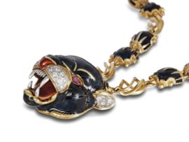 FRASCAROLO YELLOW GOLD AND ENAMEL NECKLACE WITH A PENDANT/BROOCH IN THE SHAPE OF A PANTHER
