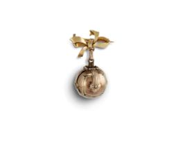 spilla con pendente dalla forma sferica. In posizione di chiusura, somigliante ad una "palla scheda elettorale" in uso durante la votazione massonica. Una volta aperto, il globo si trasforma in una croce formata da sei figure piramidali in argento, sulle cui facce sono incisi simboli massonici ed esoterici. Dim. pendente mm 19 circa, lungh. cm complessivi 6,50 circa, g 17.