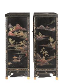 in lacca nera, nella parte superiore e laterale dipinti con paesaggi, fiori e volatili, nella parte frontale due ante con sei riserve con applicazioni in osso raffiguranti personaggi, fiori e uccelli; cm 115x79x45 (2)
