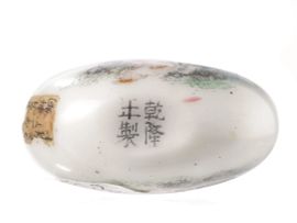 in vetro nei toni “falancai” raffigurane avanti e retro personaggi, marchio del periodo Qianlong; alt. cm 6