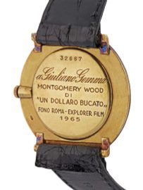 cassa tonda in oro giallo 18kt con fondello con dedica a Giuliano Gemma per il film Un Dollaro Bucato del 1965, quadrante bianco a settori ed indici a smalto, movimento a carica manuale. Cinturino in pelle. Diam. mm 33