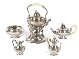 in metallo argentato, composto di samovar, teiera, lattiera, piccola caffettiera e porta bon bon, finali dei coperchi a bocciolo, argentatura consunta (5)
