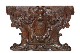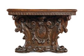 Il piano, rettangolare, ha un ciglio a becco di civetta poggiante su una modanatura a unghiature. Lo sostengono tre trapezofori, scolpiti ed intagliati in alto da un motivo simmetrico di voluta ospitante una testina femminile e un festone sottostante, che continua sinuoso verso il basso terminando in un piede ferino rifinito da una foglia d’acanto. Ogni trapezoforo è incentrato da un grande stemma, contornato da volute, festoni e maschere grottesche ed è raccordato agli altri mediante una traversa sagomata a volute e conchiglie e incentrata da quattro stemmi nobiliari.