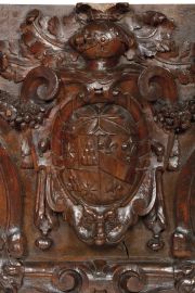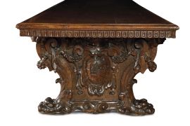L’arte dell’intaglio ligneo a Siena aveva conosciuto un periodo assai fortunato nel sedicesimo secolo. Fra le opere più importanti si ricordano le due cantorie del Duomo, quella di destra di Antonio Barili (1511), quella a sinistra disegnata nel 1550 da Bartolomeo Neroni detto il Riccio (1500-1571/3). Al Riccio si deve anche il disegno del seggio vescovile (1567, eseguito però ai primi del ‘900), del leggio dietro l’altare e della residenza (9), opere queste ultime eseguite sotto la sua direzione. Proprio dall’opera di Riccio l’artefice del nostro tavolo parte, ricercando un medesimo effetto di grandiosa severità, raggiungendolo non più con una accentuazione degli elementi architettonici, bensì sottolineando e dilatando quanto di decorazione scultorea era presente nell’opera dei Neroni: festoni rigonfi, testine, cartigli.