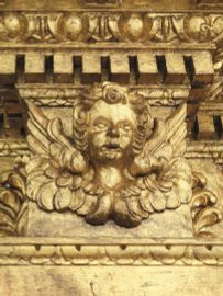 La monumentale cona, oggi indubbiamente snaturata perché fuori dal suo contesto originario e considerata addirittura un “portale”, nonostante alcuni elementi accuratamente rifatti, perfettamente distinguibili dal resto, è un’opera di rilevante interesse storico-artistico. La qualità e la raffinatezza dell’intaglio, uniti ad uno stile riconducibile alla produzione veneta degli inizi del XVII secolo, fa supporre che l’oggetto sia stato prelevato in epoca imprecisabile da una cappella gentilizia del territorio di produzione. Influssi della scultura veneta, vicina ai modi di Jacopo Sansovino, infatti, si colgono nei due putti alati, seppur con le dovute cautele.