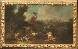 NATURE MORTE DI SELVAGGINA ALL'APERTO CON CANI DA CACCIA