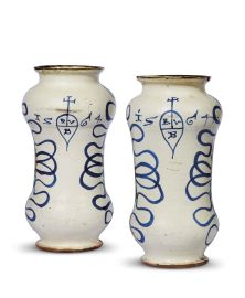 La coppia di albarelli ha imboccatura rotonda, con orlo estroflesso dal profilo arrotondato, collo breve che si apre su una spalla rigonfia e arrotondata, corpo cilindrico fortemente rastremato al centro secondo la tipica forma a rocchetto. Il corpo si apre in calice rigonfio che scende in un piede basso dall’orlo tagliato a stecca e poggiante su una base piana.
