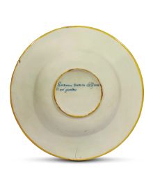 Il piatto ha profondo cavetto e larga tesa obliqua con orlo arrotondato, il retro poggia su un basso piede ad anello appena accennato, al centro del quale è delineato in corsivo in blu di cobalto la scritta Susanna tentata dallj vecc/hi nel giardino, ed è listato di giallo a segnare l’orlo e il piede.