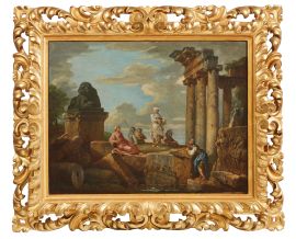 Da tempo noto agli studi sul Panini, e invece del tutto nuovo al mercato dell’arte, il raffinato “capriccio” qui offerto propone un tema assai frequente nel catalogo del pittore piacentino, se pure declinato con sottili varianti nel numero dei personaggi e nella loro disposizione e, soprattutto, negli elementi architettonici e scultorei che ne costituiscono la cornice e insieme il vero soggetto.