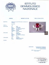 sulla sommità un rubino taglio cuscino di ct 2 circa ed un diamante taglio cuscino di ct 1 circa, affiancati da diamanti taglio baguette, mis. 15, g 8