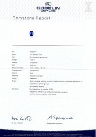 al centro uno zaffiro taglio ottagonale ct 7.28 affiancato da diamanti taglio carrè e brillante per ct 1.20 circa, mis 12, g 15. Corredato di certificato Gubelin del 28/10/2014 attestante la provenienza e l'assenza di trattamenti termici