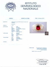realizzato a fascia bombata impreziosita da diamanti taglio brillante per ct 3.30 circa e taglio baguette per ct 2.40 circa, al centro un rubino di ct 3.10 circa, mis.21, g 11,40 circa. Corredato di certificato IGN del 13/03/2019 che ne attesta le caratteristiche e la provenienza geografica
