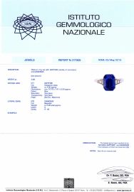 al centro uno zaffiro taglio ottagonale di ct 4 circa, affiancato da diamanti taglio baguette per ct 0.20 circa, mis. 9, g 2. Corredato di certificato I.G.N del 3/5/2019 che ne attesta le caratteristiche e l'assenza di trattamenti termici.