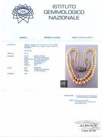 composta da perle naturali di acqua salata digradanti da mm 9 a mm 3, fermatura in platino con diamanti taglio antico per ct 2.80, punzone PT, lungh. filo corto cm 44 circa, lungh. filo lungo cm 47 circa, g 54 circa. Corredato di certificato I.G.N. del 27/02/2019 attestante le caratteristiche.