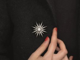montato su una spilla in oro bianco a forma di stella impreziosita da diamanti taglio brillante e huit huit per ct 1.20 circa, lungh. cm 5 circa, g 16
