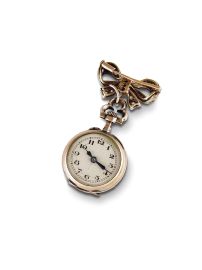 realizzato a motivo di fiocco da cui pende un orologio amovibile a carica manuale quadrante con numeri arabi, diam. orologio mm 20 sulla spilla e il fondello diamanti taglio rosa per ct 3.80, lungh. cm 4,5, g 14